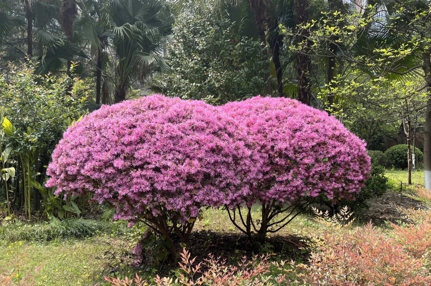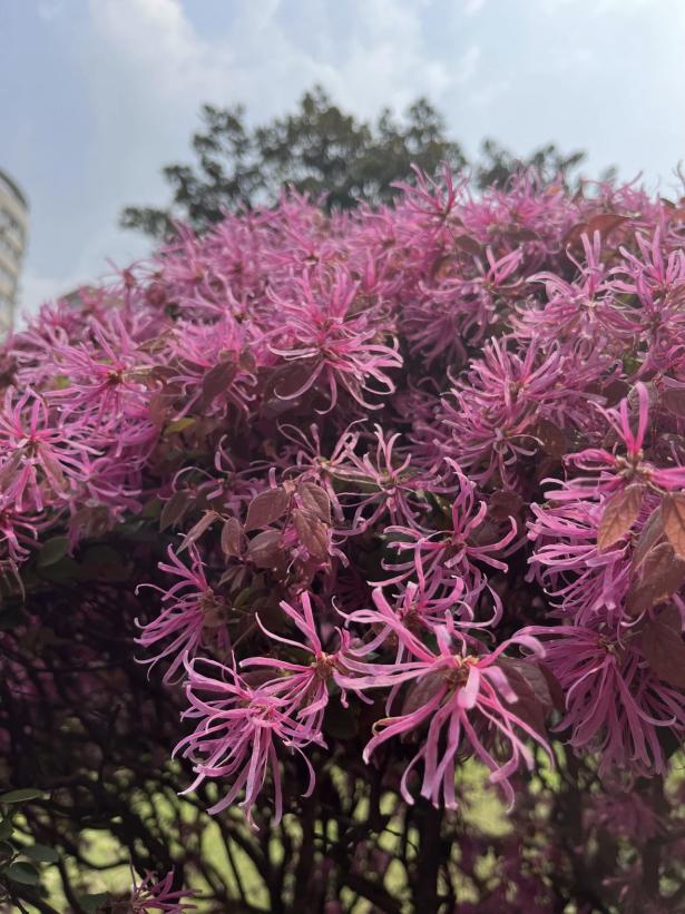 红花檵木是校园中较为常见的绿化植物,遍布校园各处,不开花时以紫红叶片默默装点校园。若想观赏其花团锦簇的盛景,需前往公司南区9教旁边的花园,此处的红花檵木花期时繁花满树,艳红花朵如朝阳般热烈,是校园里独具特色的景致。